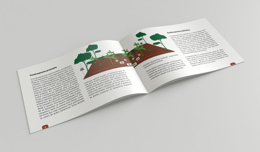Cartilha em formato A5 horizontal, dirigida para pequenos agricultores. Foram utilizadas imagens e ilustrações “stock”. Criei alguns diagramas de utilização de árvores para proteção das mudas.