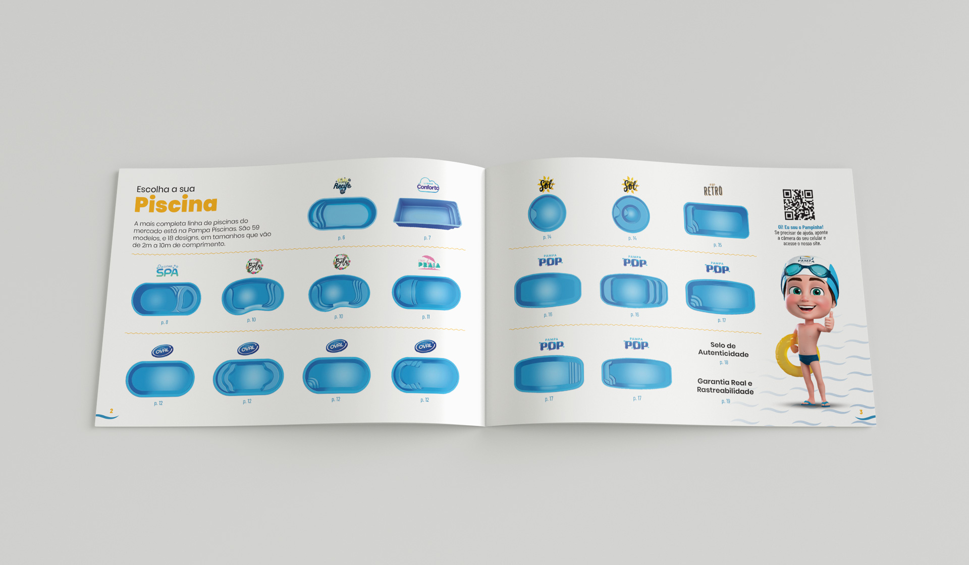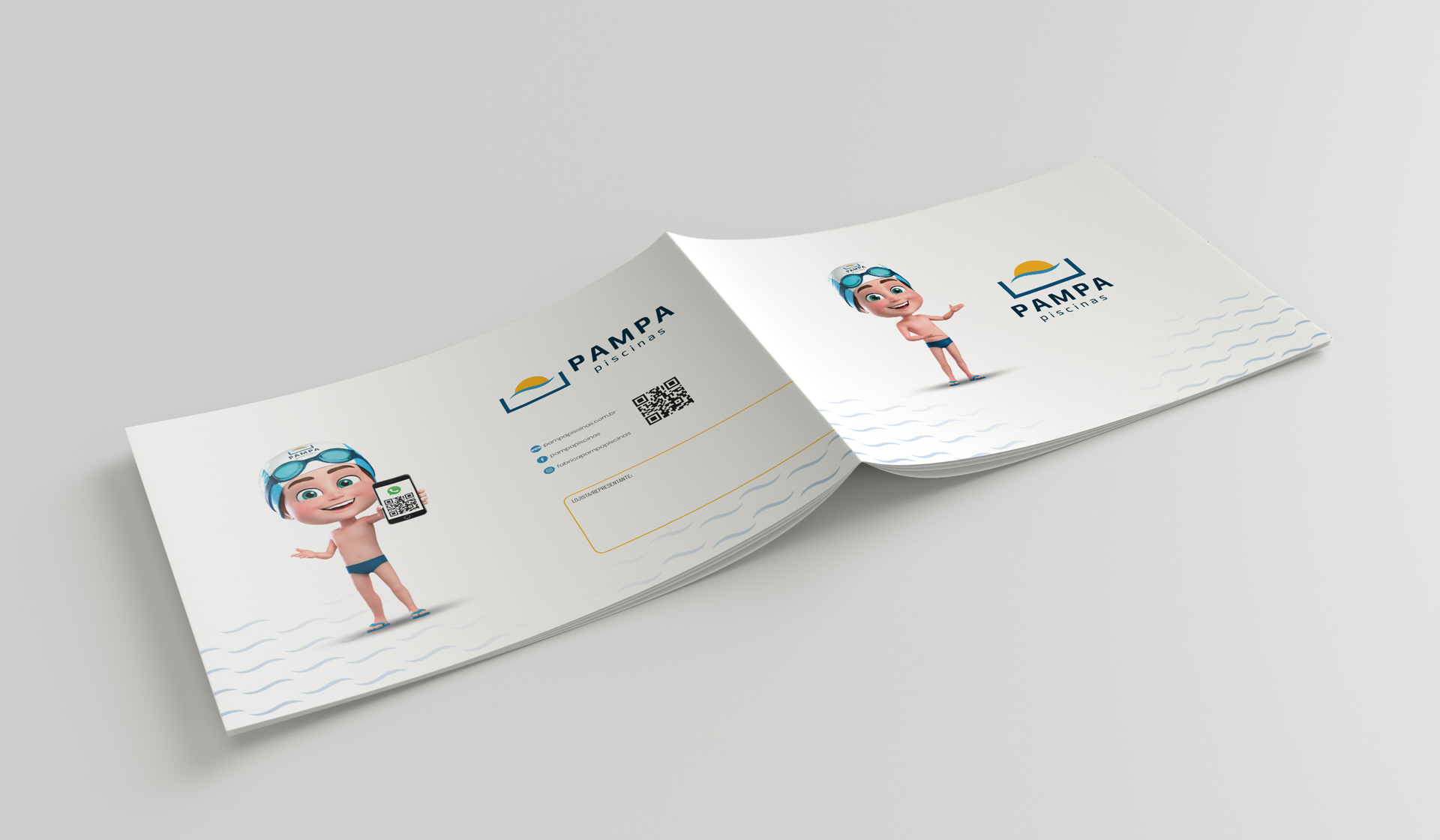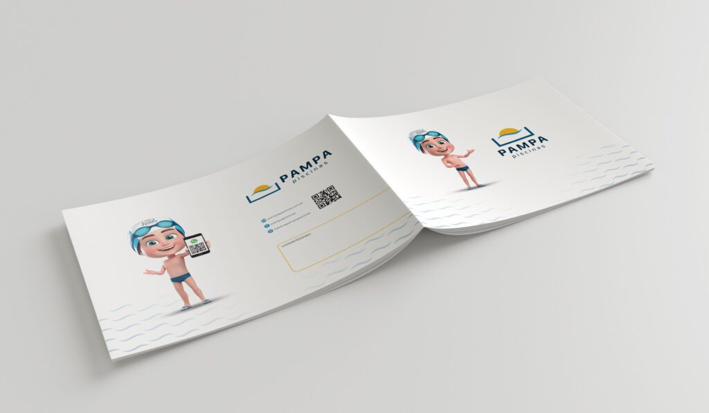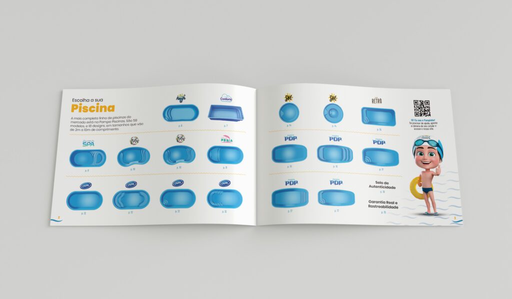 Catálogo de produtos para a fabricante Pampa Piscinas, localizada em Gravataí/RS. Em formato A5, a peça utiliza formas curvas para os “renderings” e imagens com fundos transparentes para os produtos. O uso de QR Codes leva o leitor ao site ou para atendimento direto no WhatsApp.
