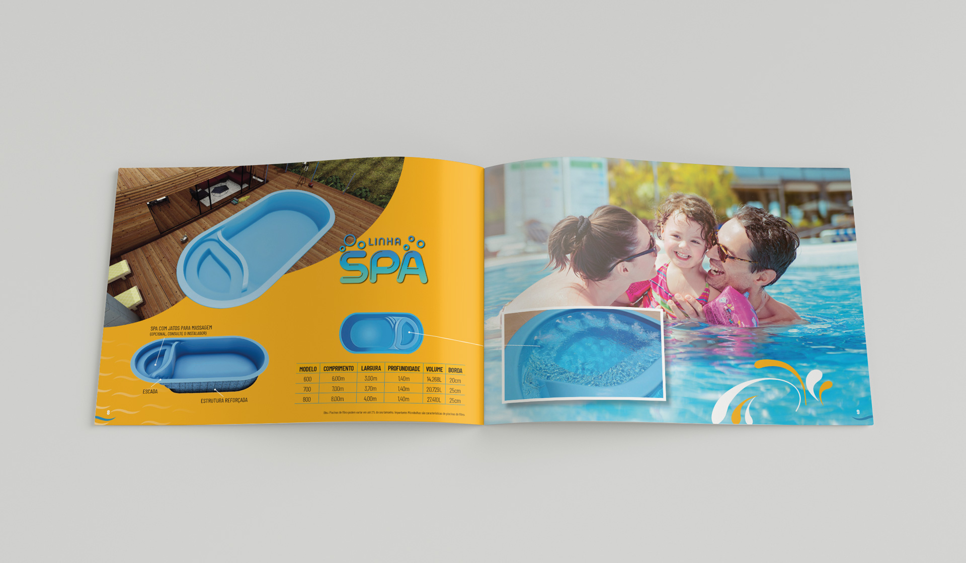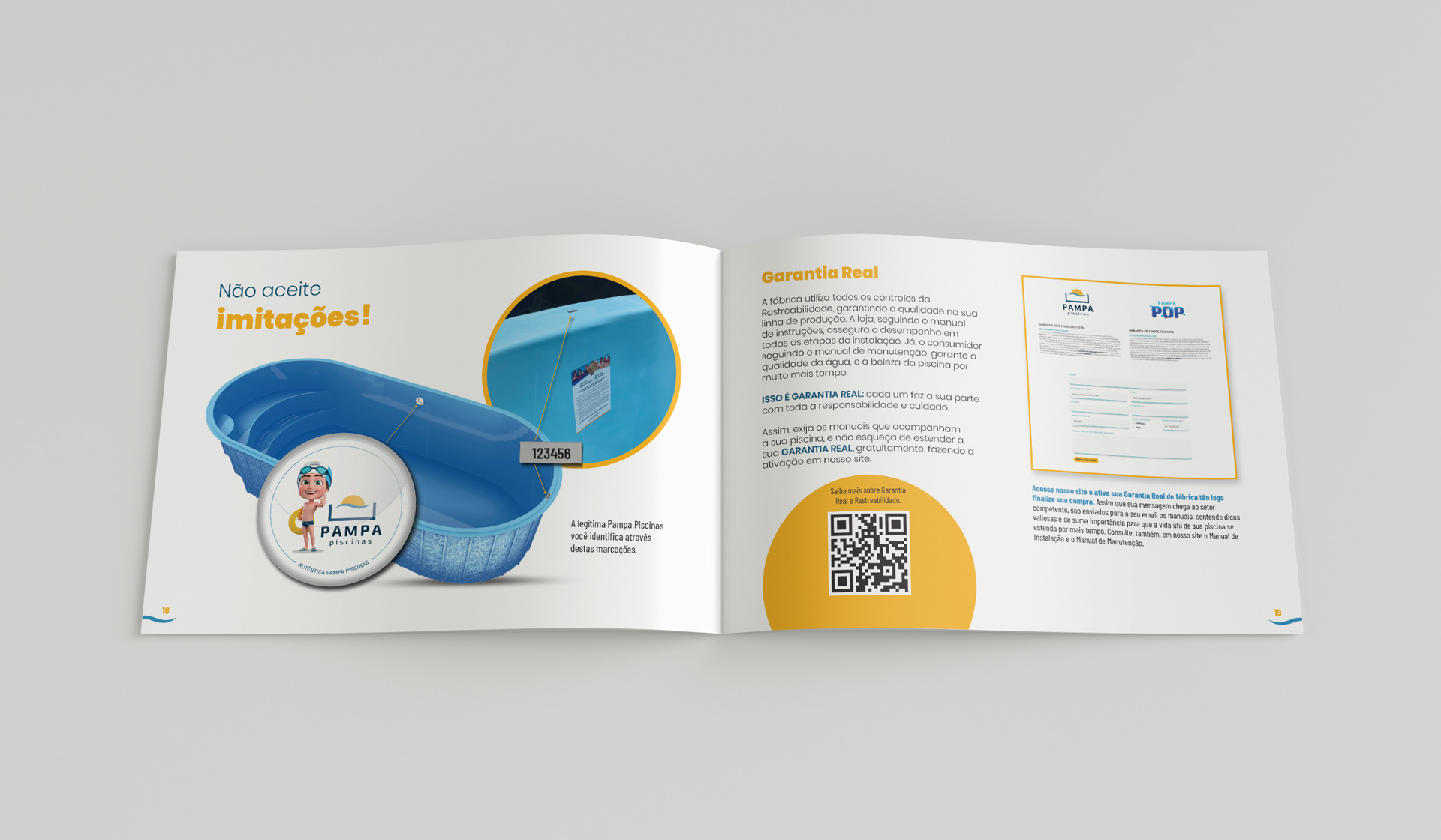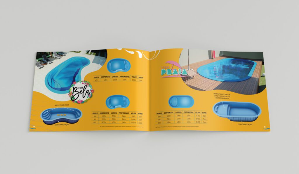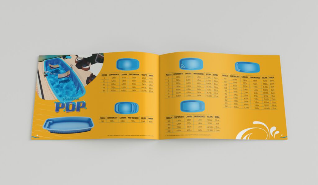 Catálogo de produtos para a fabricante Pampa Piscinas, localizada em Gravataí/RS. Em formato A5, a peça utiliza formas curvas para os “renderings” e imagens com fundos transparentes para os produtos. O uso de QR Codes leva o leitor ao site ou para atendimento direto no WhatsApp.
